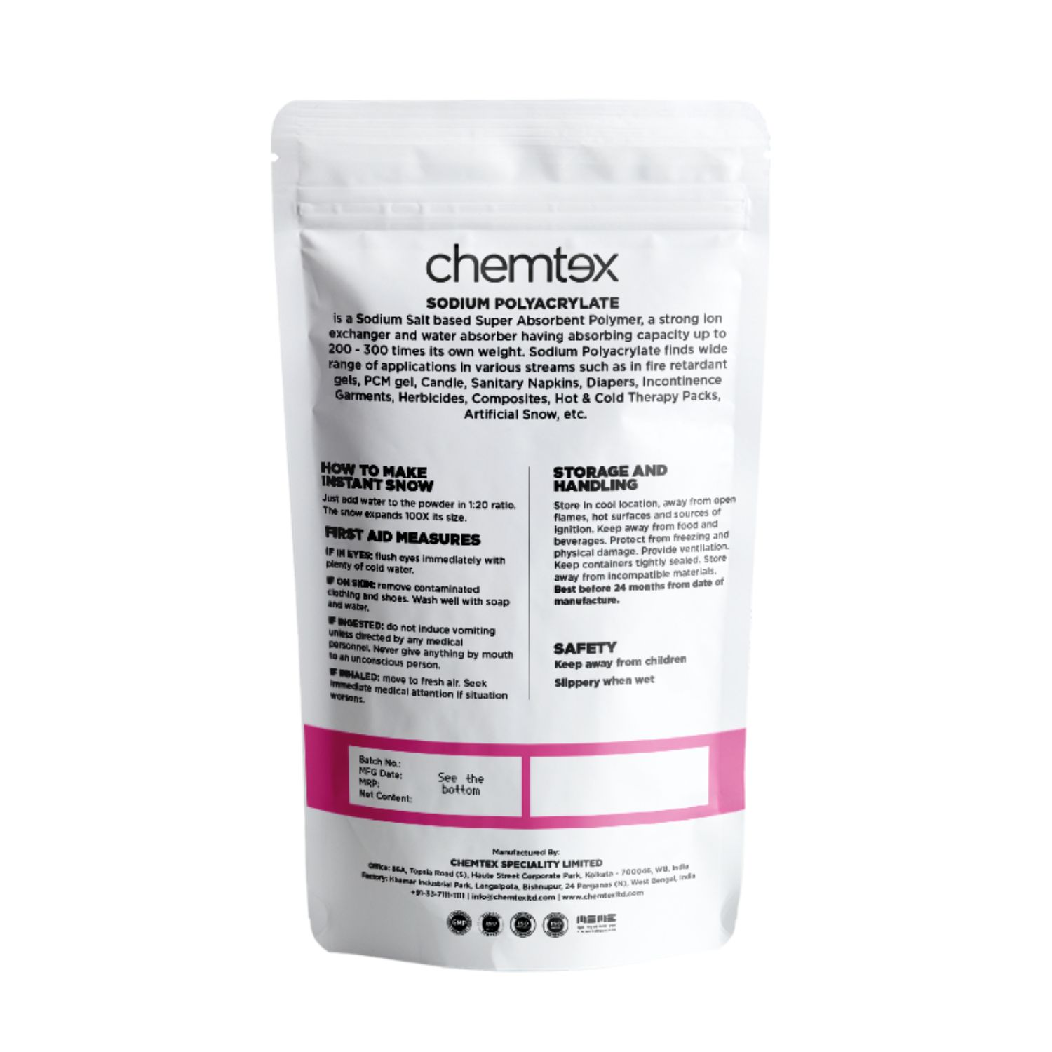 • High Water Retention: Chemtex instant snow is able to hold water for longer periods of time, which comes handy in decorative media for variety of purposes